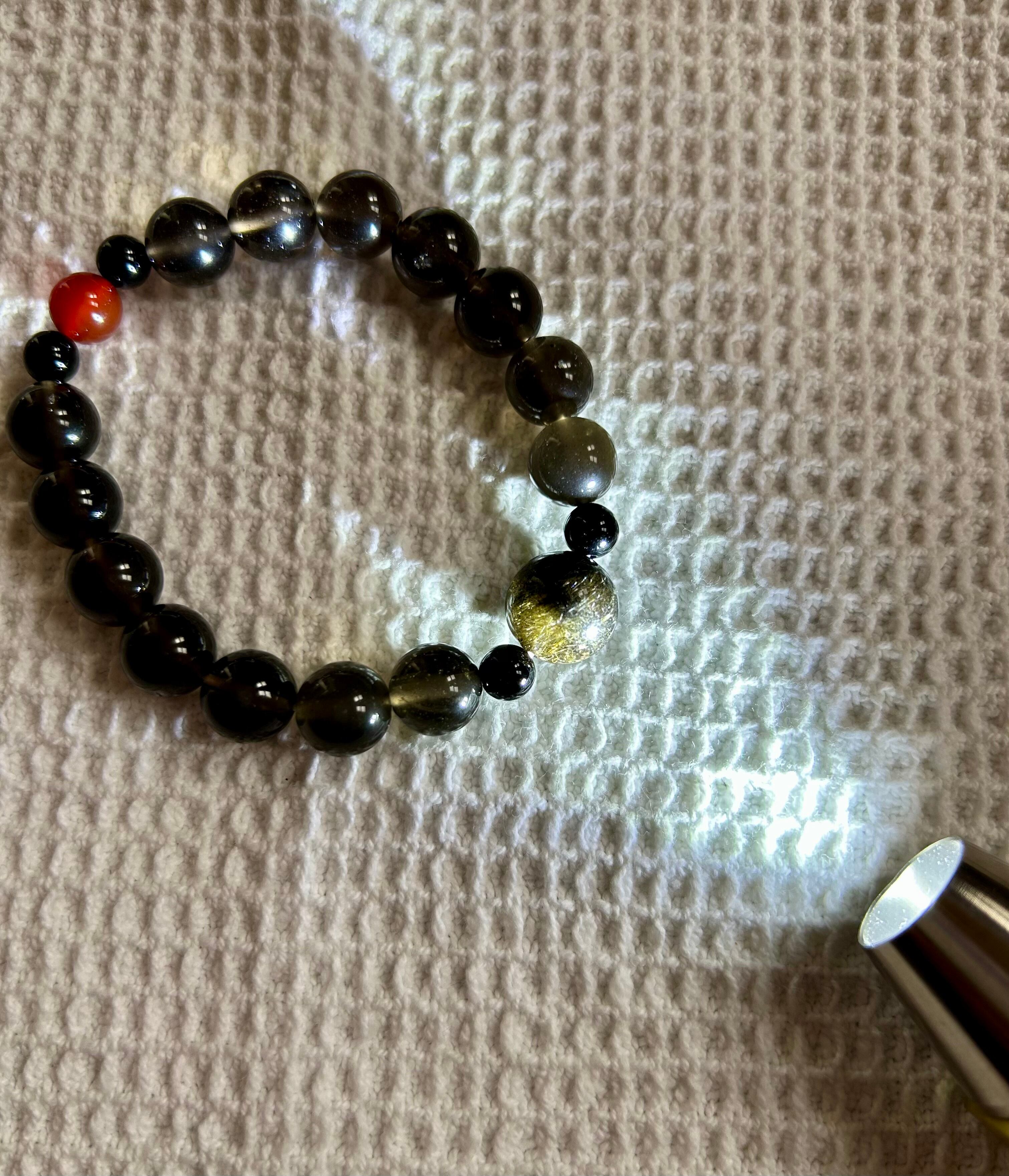 特別な天然石を巧みに組み合わせた、強運を引き寄せるパワフルなブレスレットです。この魅力的なブレスレットには、大玉のプラチナルチル、幸福の象徴であるチンタマーニ、活力を与えるレッドアゲート、そしてオニキスが使用されており、身に着けることで運気の向上が期待できるとされています。洗練されたデザインが特徴で、さまざまなシーンにマッチし、あなたの日常を一層輝かせることでしょう。また、大玉のプラチナルチルの独特の輝きが、あなたの魅力をさらに引き立ててくれます。伸縮性のあるオペロンゴムを使用しているため、着脱も楽々で快適な着用感を実現しています。