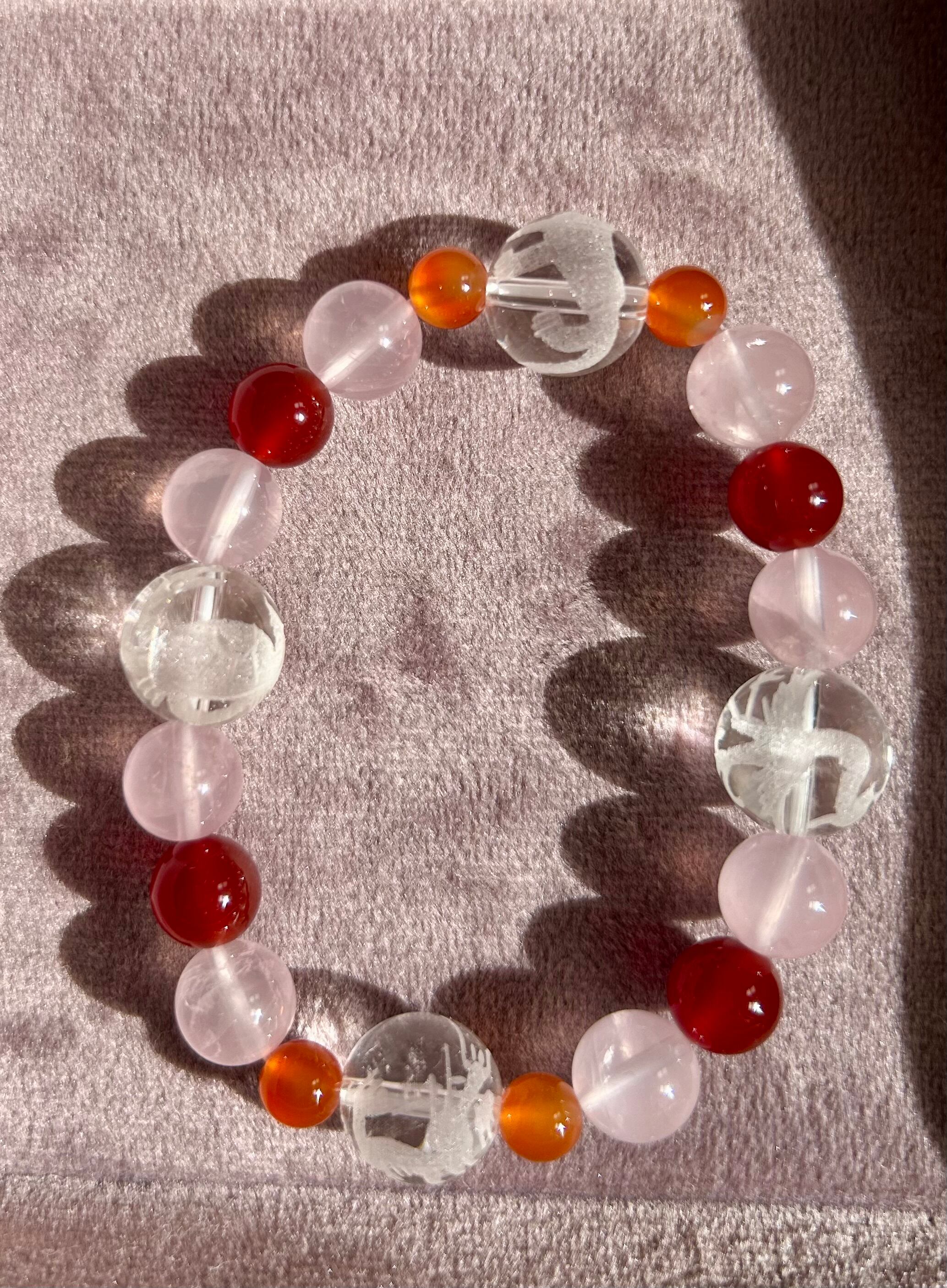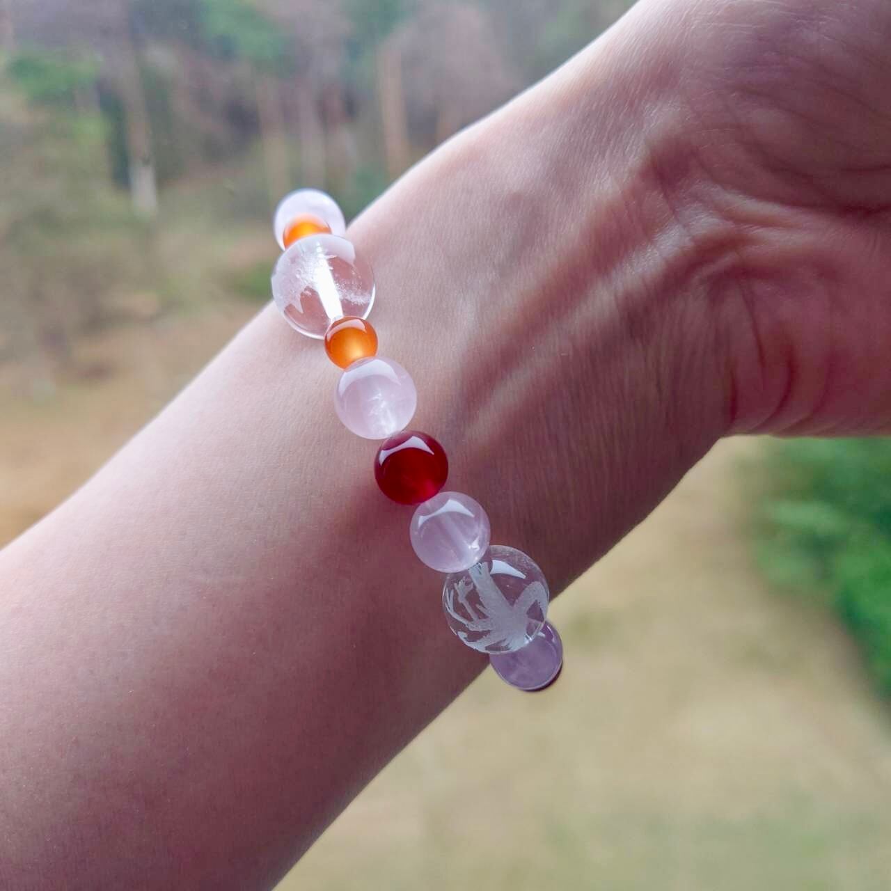 特別な天然石を巧みに組み合わせた、女性性の魅力を引き出すブレスレットです。この美しいブレスレットには、四神獣水晶の神秘的なエネルギー、愛を象徴するローズクォーツ、そして自信を与えるカーネリアンとレッドアゲートが使用されており、身に着けることで女性らしい魅力を高めるとされています。洗練されたデザインが特徴であり、どんなシーンにもフィットし、あなたの日常を一層引き立てます。また、伸縮性のあるオペロンゴムを用いているため、つけ心地も快適です。