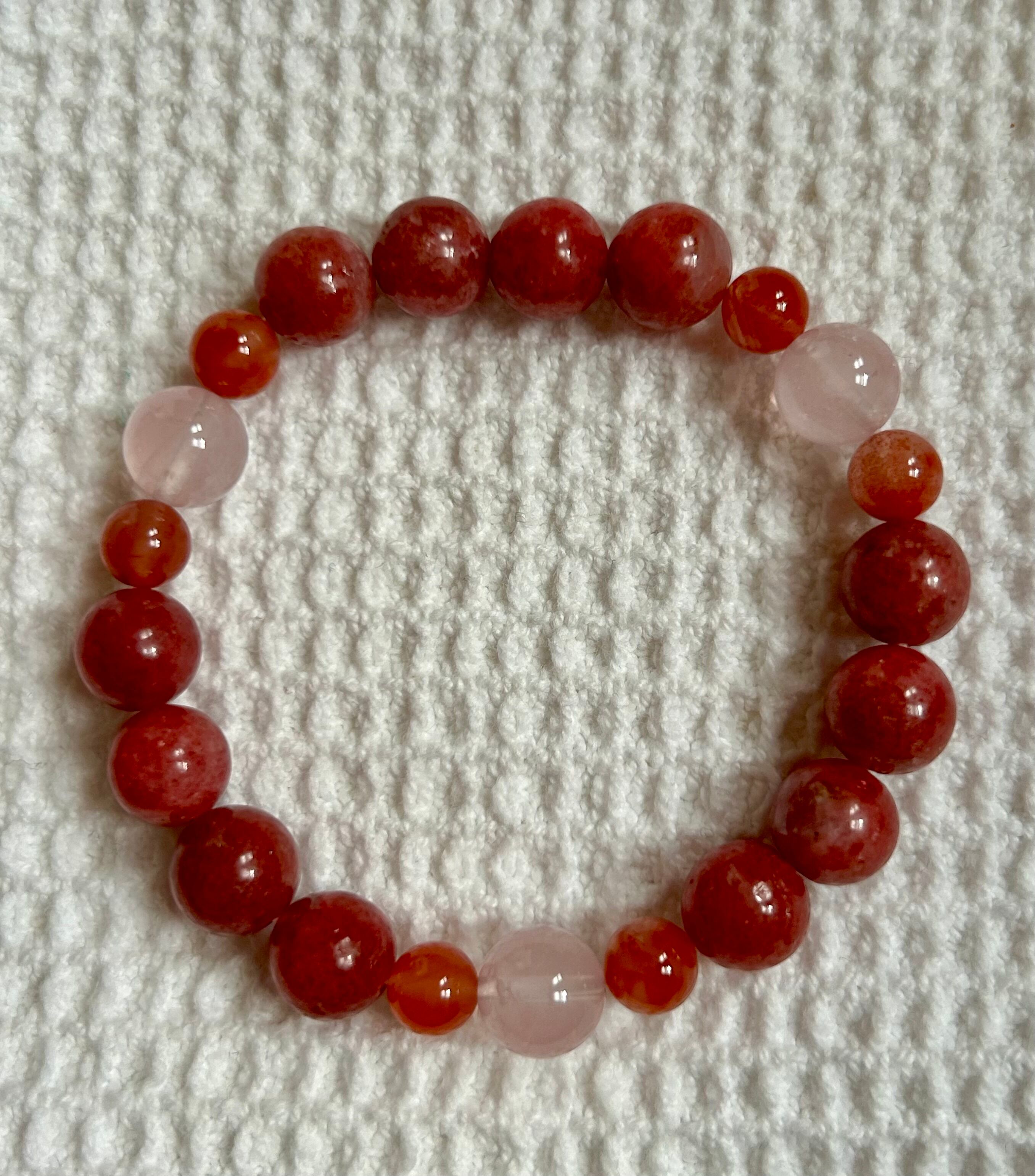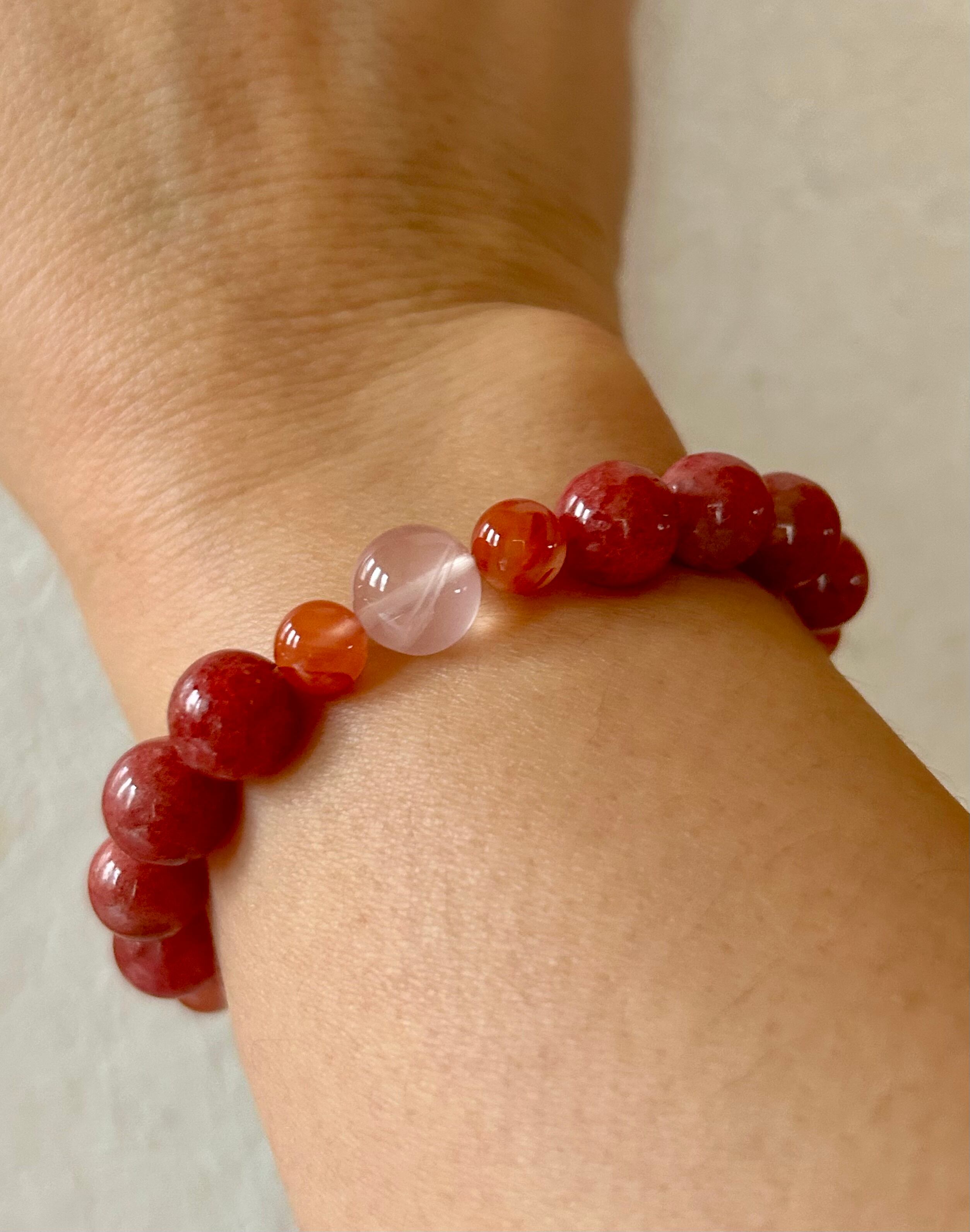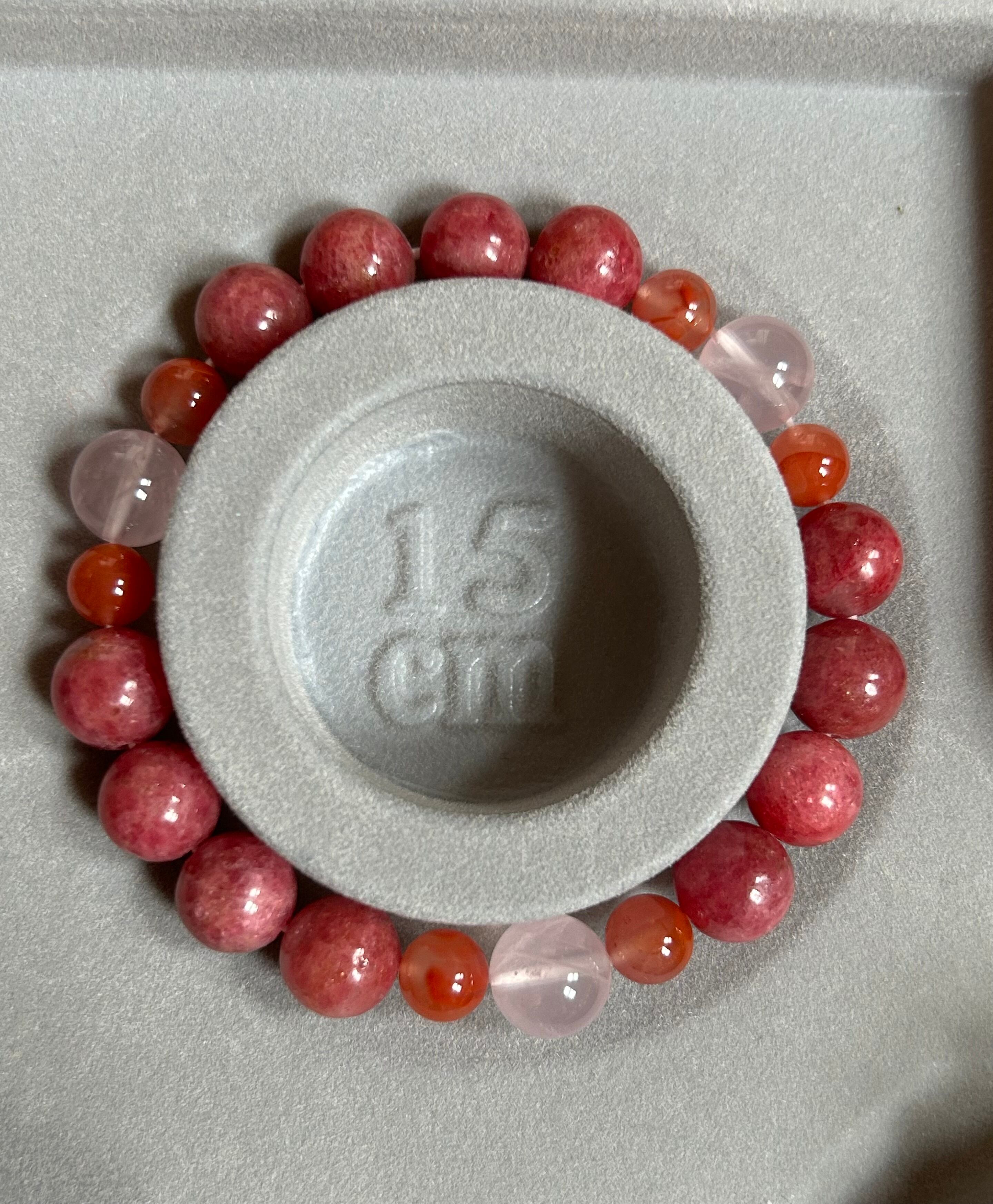 優雅なピンクが特徴のロードナイトデザインブレスレットです。このブレスレットには、愛と感情のバランスをもたらすロードナイト、心の癒しをサポートするローズクォーツ、そして心身を安定させるナンホーンアゲートが巧みに組み合わされています。身に着けることで、穏やかな気持ちを促し、日常生活をより豊かに彩るお手伝いをします。シンプルでありながら魅力的なデザインは、多様なスタイルに調和し、肌馴染みも良く、特別なひとときを演出します。また、伸縮性のあるオペロンゴムを使用しているため、快適な着用感をお楽しみいただけます。