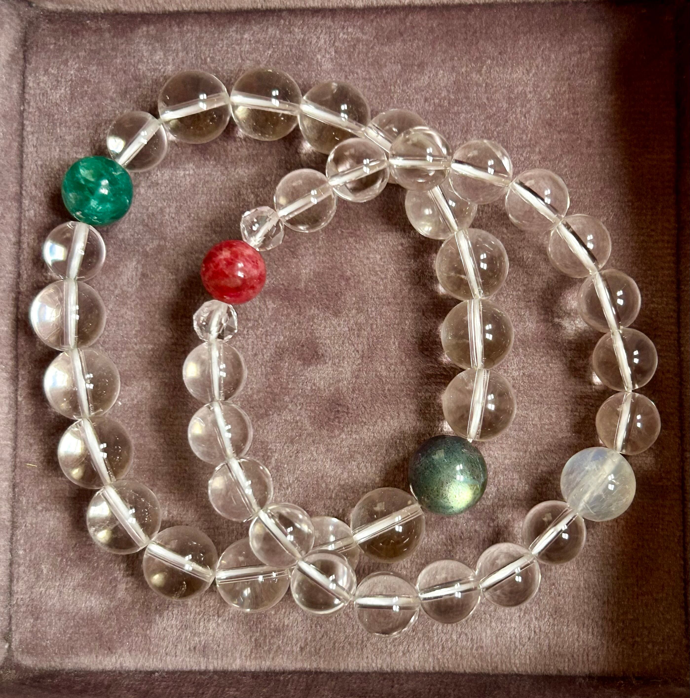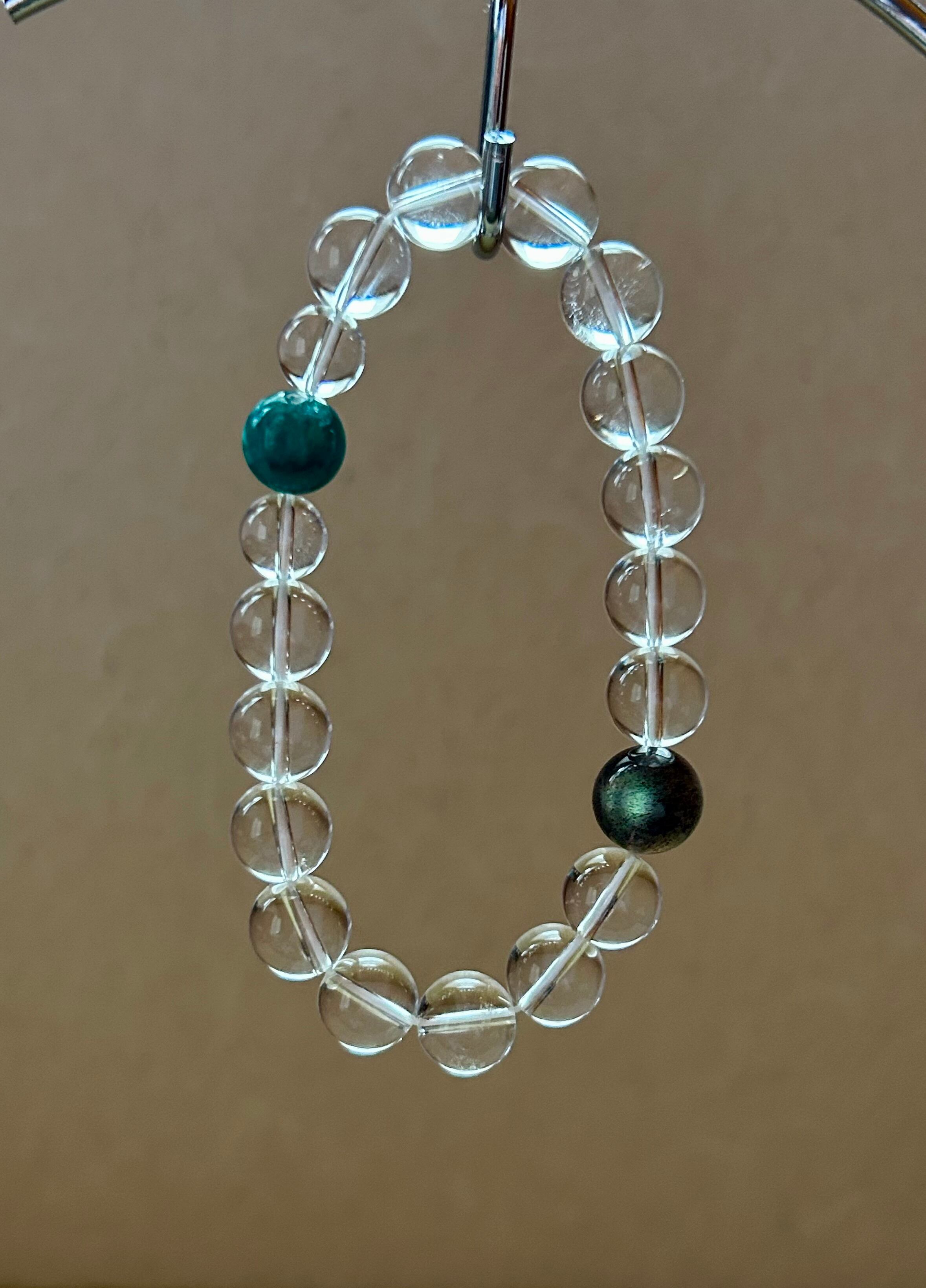 神秘的な美しさを持つ最高級クリスタルデザインブレスレット②です。このブレスレットには、深い色合いが魅力のラブラドライト、自然のエネルギーを宿すグリーンマイカ、そして浄化とバランスをもたらす水晶が完璧に組み合わされています。身に着けることで、内面の調和を促し、心に安らぎをもたらすお手伝いをします。シックで洗練されたデザインは、あらゆるシーンにおいてあなたのスタイルを引き立て、特別な瞬間を演出します。また、伸縮性のあるオペロンゴムを使用しているため、優れたフィット感を実現しています。